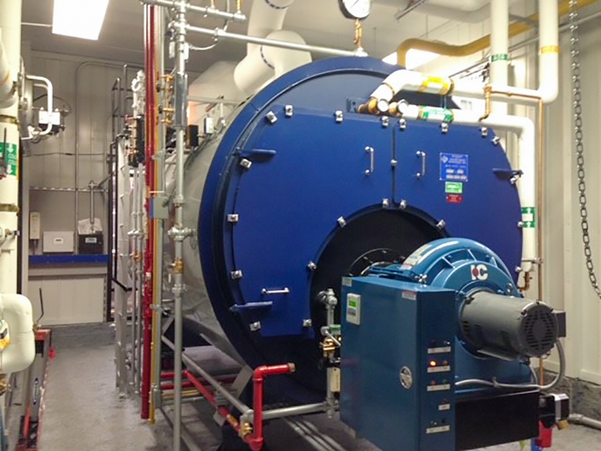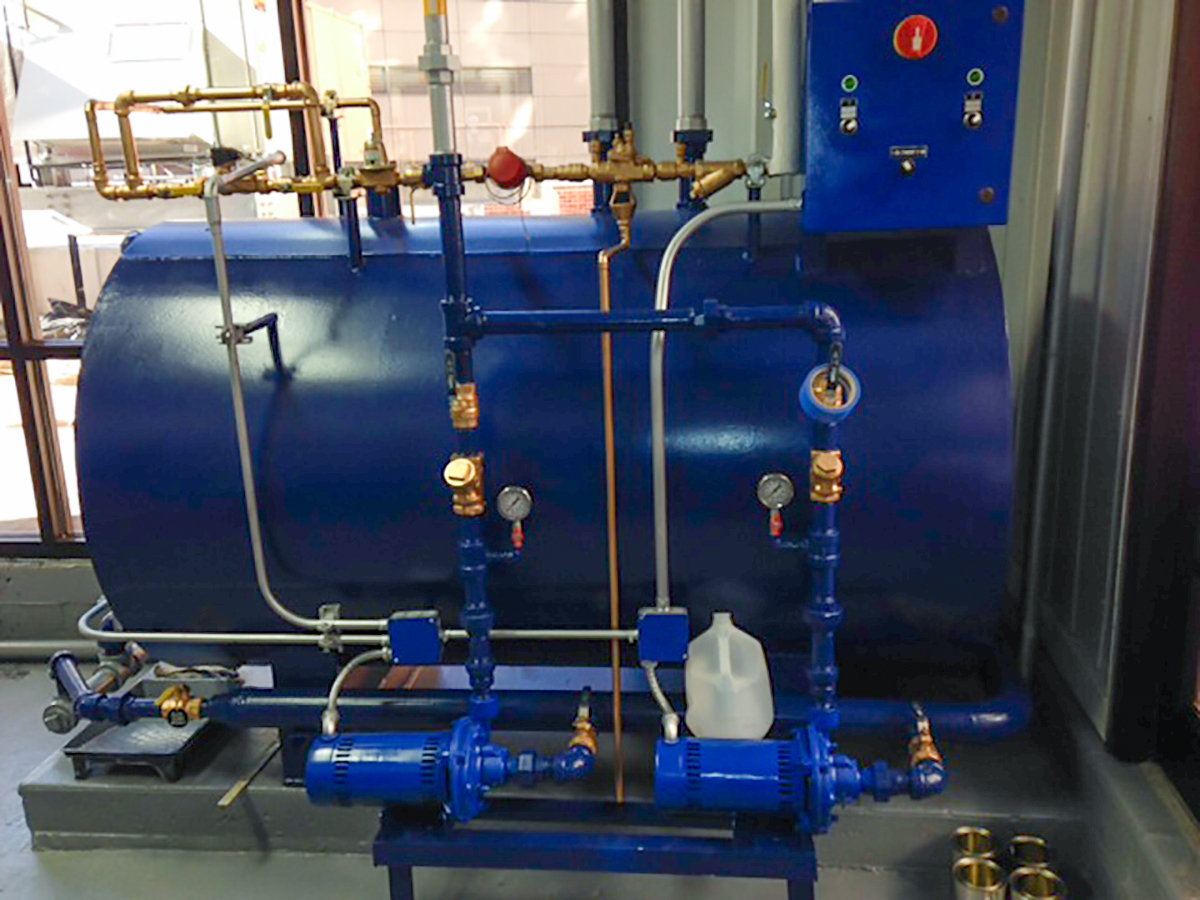 There were many challenges to overcome. The building had no available space to install a 200 HP boiler and virtually no place to install a chimney stack so when the commercial space on the upper floor of the 2 story commercial building became vacant our engineering team went to work to design a new boiler room on its roof. The roof was reinforced for added support, a very attractive structure was constructed and the new boiler equipment was installed inside the new all glass structure.